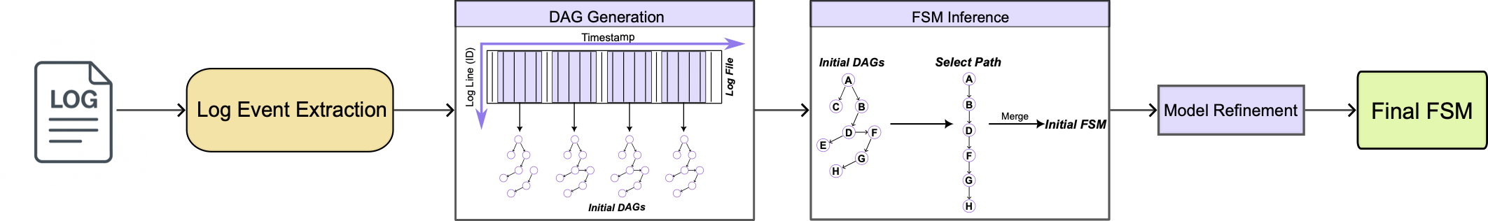 PHOENIX builds directed acyclic graphs from event sequences, computes bidirectional confidence metrics for transitions, prunes weak edges using a configurable threshold, and extracts high-coverage initial FSM paths. An iterative refinement process then incrementally incorporates additional paths until coverage and acceptance thresholds are satisfied.
